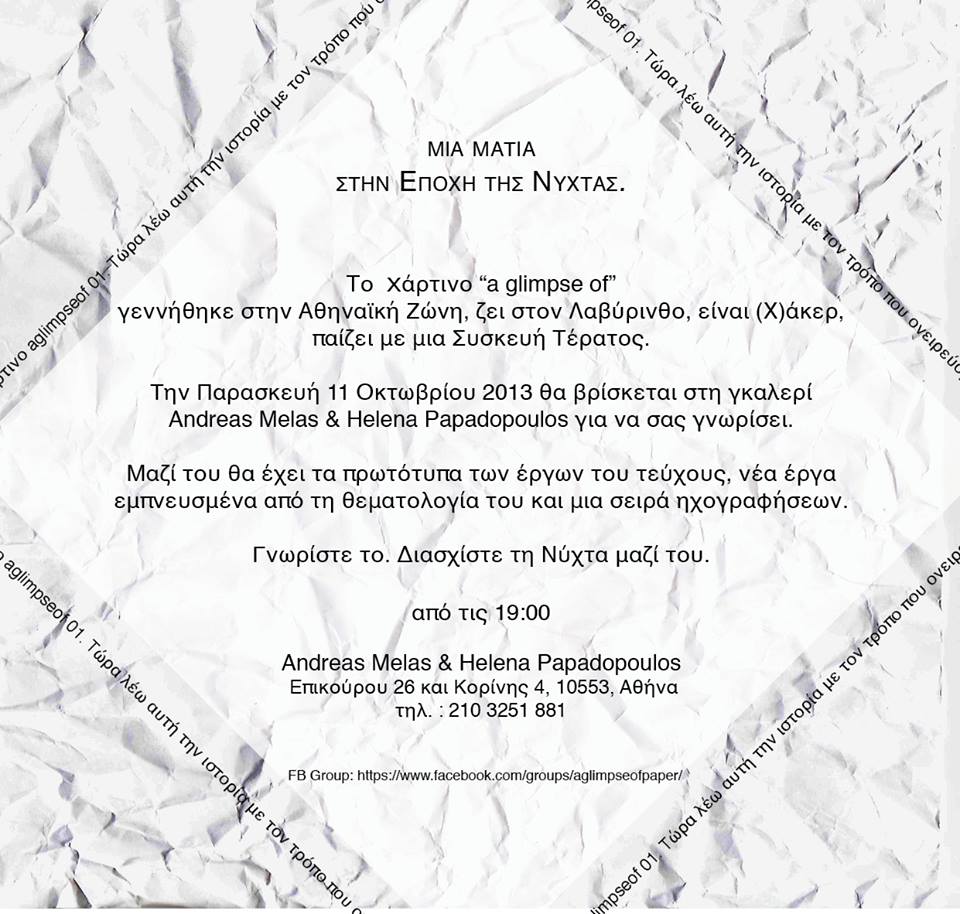 On Friday 11th October the paper “a glimpse of” was presented at the gallery Andreas Melas & Helena Papadopoulos in Athens, with the Issue’s original artworks, and some new ones inspired by its themes by John Morgan, Anthony Katsouris, and Amalia Vekri. It was alson an opprotunity to see the portraits of the journal photographed by Yoko Danno in Kobe, and hear the recordings of Apostolis Artinos, Sophie Mayer, and Theordoros Chiotis’s works.