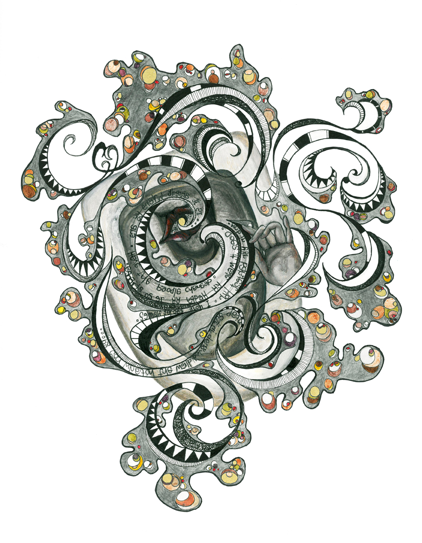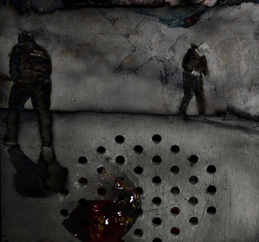 Ένα στόμα έτοιμο να μιλήσει, να φιλήσει, να ρουφήξει ίσως, παρά να ξεράσει τα περιττά μιας υπερφαγίας/υπερκατανάλωσης. Σε ένα δεύτερο επίπεδο καταβροχθίζεται από ένα άλλο στόμα τον πάτο της λεκάνης. Το καθρεφτιζόμενο χέρι είναι το δεξί που μπαίνει στην είσοδο του οισοφάγου και με το δάχτυλο  προκαλεί. Αντιστρέφοντας, είναι το αριστερό χέρι στήριγμα στο μέτωπο κατά τη διαδικασία. Στην αποτύπωση θυμίζει το χέρι-ευχή του Ιησού στις αγιογραφίες και την ιεροτελεστία που κρύβει η επανάληψη. Και είναι μια δίνη που επαναλαμβάνεται και χάνεται με κάθε τράβηγμα του νερού.